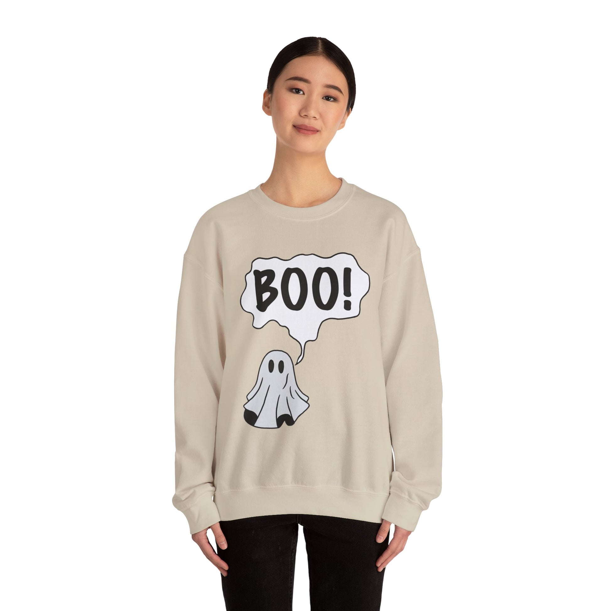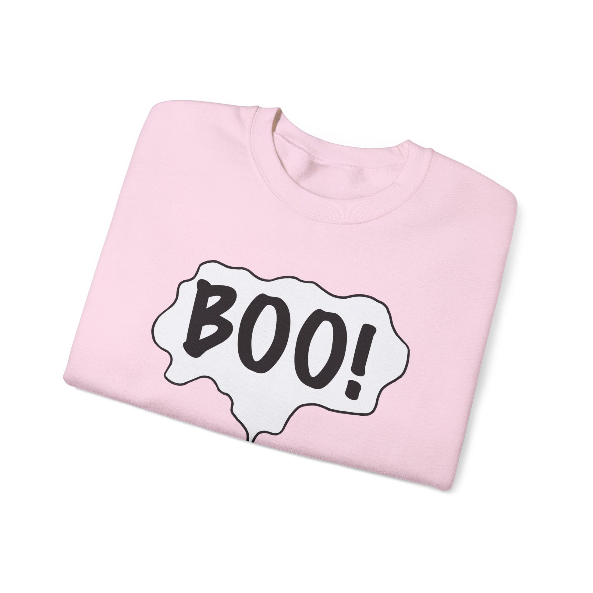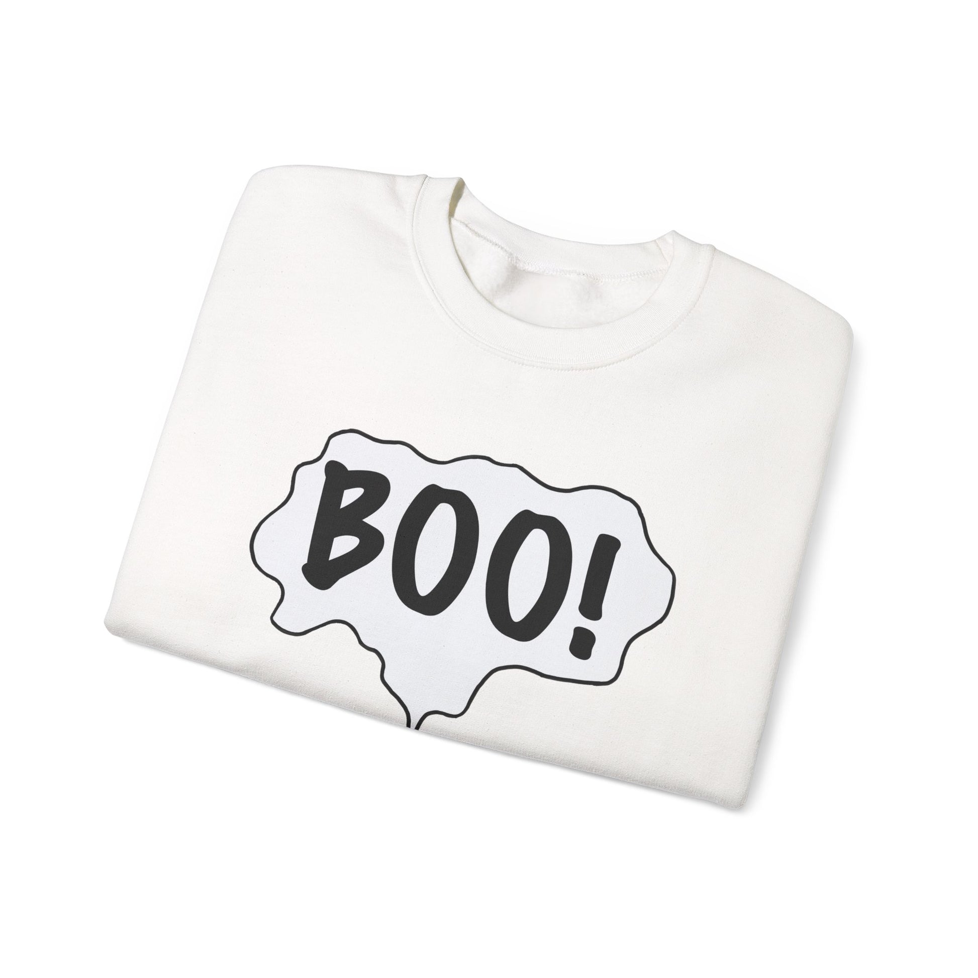 Embrace the fun and spooky spirit of the season with this cozy Crewneck Sweatshirt. Featuring a playful ghost graphic with the word 'BOO!', this sweatshirt is perfect for anyone looking to add a whimsical touch to their wardrobe. Its classic fit and soft fabric make it an ideal choice for chilly fall days or Halloween parties, ensuring you stay warm and comfortable while showcasing your playful side. This sweatshirt fits perfectly into a casual day out, lounging at home, or festive gatherings, making it a versatile addition to your fall wardrobe. Ideal for all ages, it’s a fantastic gift for Halloween enthusiasts, friends, or family who love to celebrate the spooky season. Whether you're decorating for a Halloween event or just want to add some seasonal flair to your everyday attire, this sweatshirt is a must-have for the occasion.